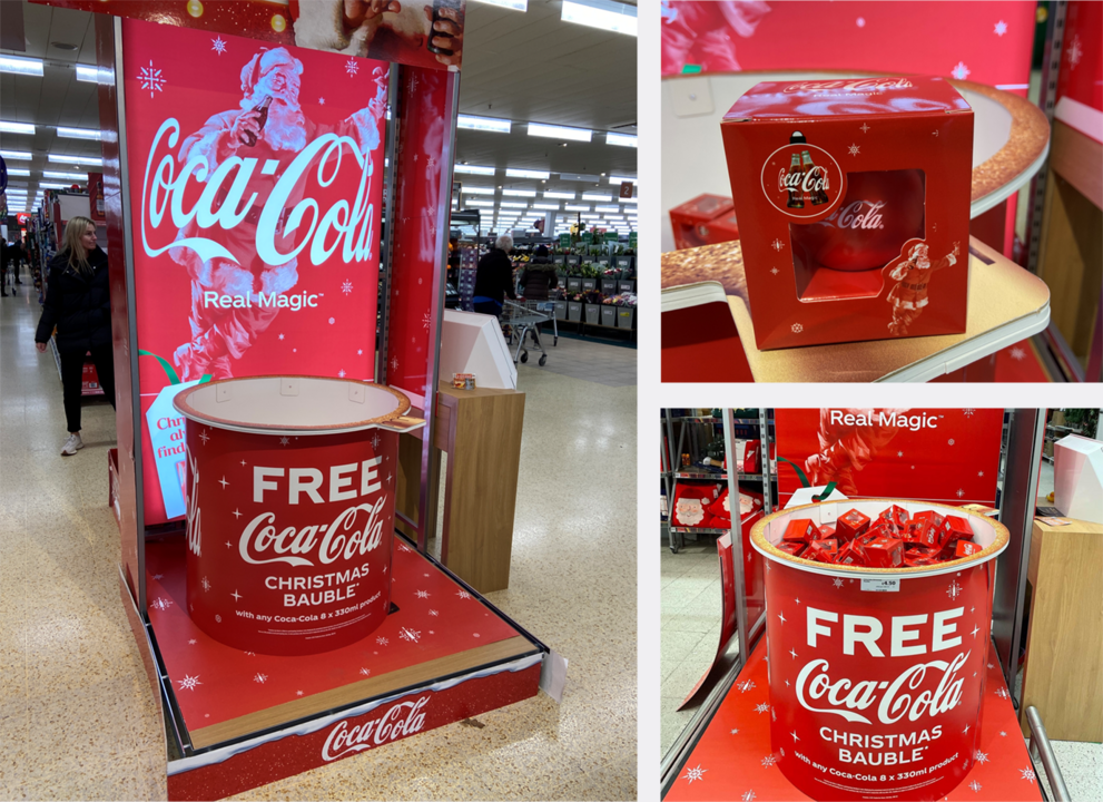 - Coca-Cola set up a disruptive in-store activation giving away free branded Christmas Baubles to consumers who purchase any Coca-Cola 8 x 330ml packs.
