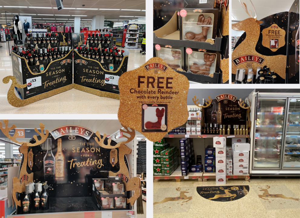 - Baileys have set up eye-catching displays across stores using excellent cardboard engineering. POS vary from a sleigh pallet, reindeer FSDU, reindeer antlers emerging out of the POS and Baileys Xmas designs being displayed across the floor.