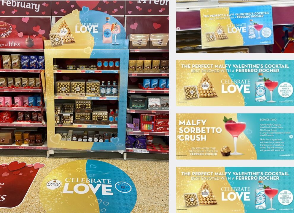 - Malfy Gin and Ferrero Rocher teamed up for a Valentine’s duo, celebrating love with a bold combined creative treatment and themed aisle presence