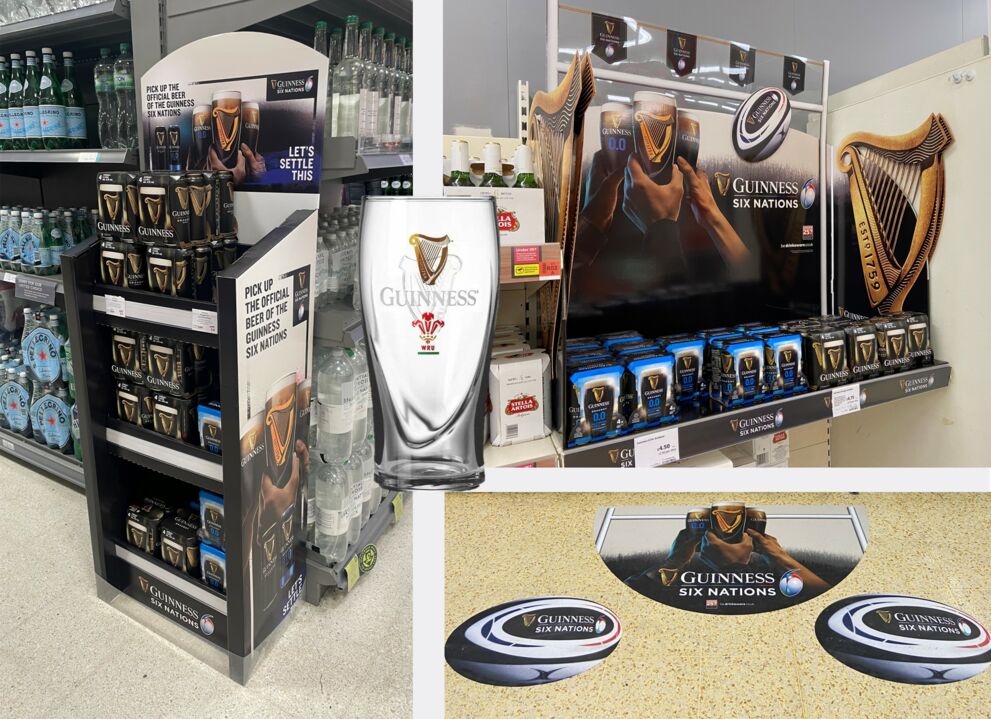 - Guinness has effectively used their brand colours and hero asset, the harp, as a bold, engineered cutout. The floor vinyls and branded bunting gives the sense of sportsmanship and stadium camaraderie