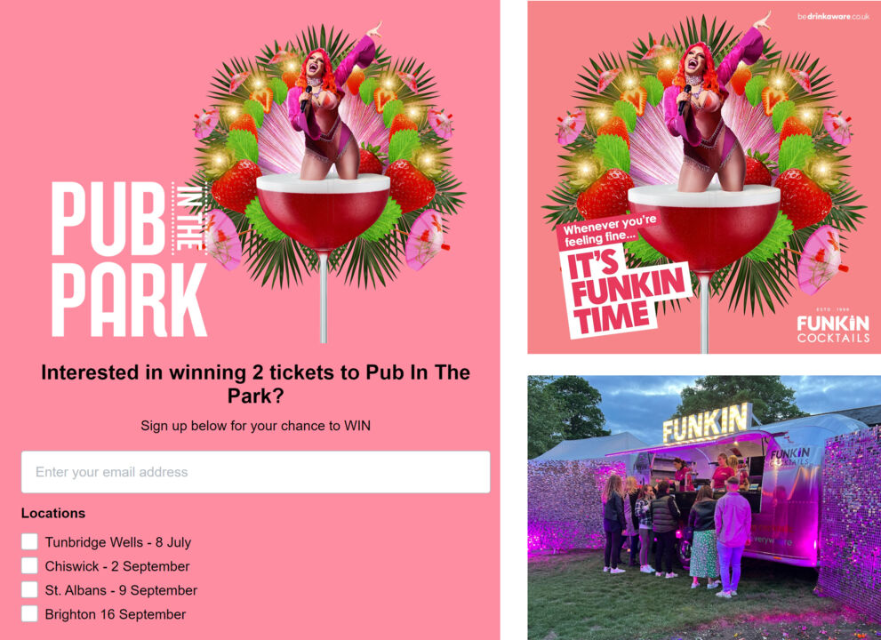 - Funkin Cocktails set up cross channel paid social posts with a registration form where the public provided their email address and chose 1 out of the 4 locations in order to be in a draw to win 2 tickets to Pub In The Park.