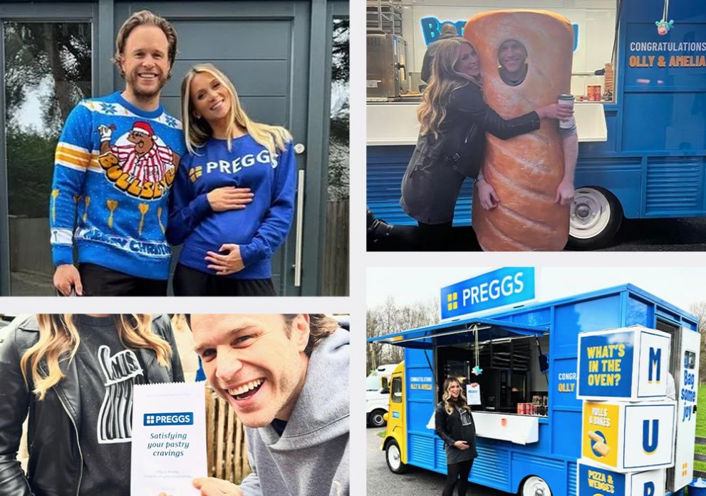 Pop star Olly Murs surprised his wife Amelia with the perfect baby shower, thanks to a collaboration with Greggs. Dressed as a giant sausage roll, he made a surprise appearance at their local village hall.
