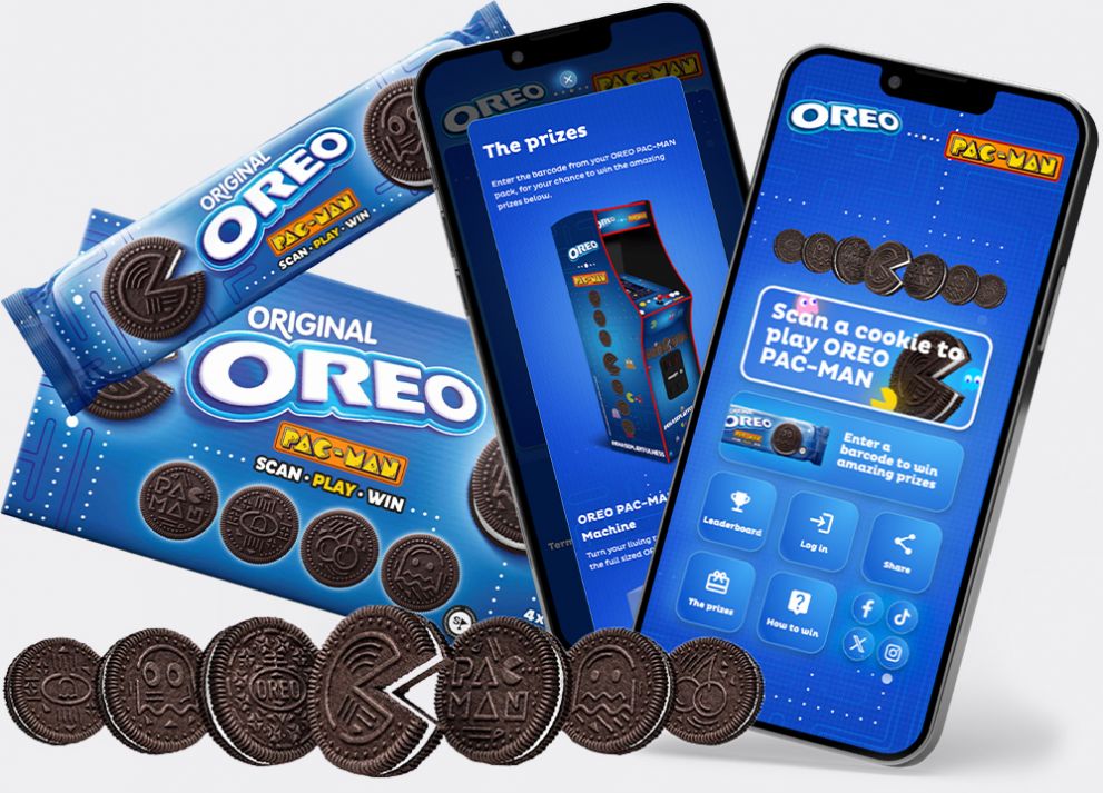 Oreo have teamed up with Pac-Man to release six special edition cookies, featuring unique packaging designs to accompany the scan, play, win promotion.