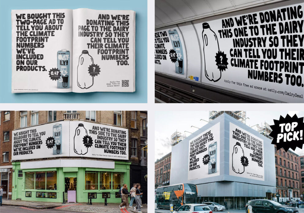 A challenging campaign from Oatly, offering cows milk sector brands advertising space if they display the full carbon footprint of their products.