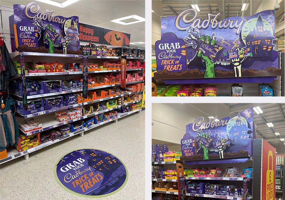 Branded shelves create a standout look for Cadburys Halloween campaign. The activation focusses on making Cadbury’s products the front of mind choice for trick or treating.