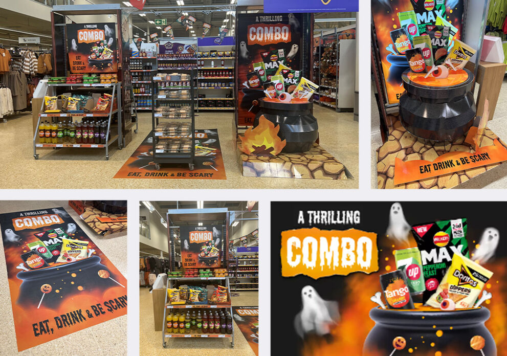A front of store activation from PepsiCo for a combo of its brands, some not typically Halloween, with the CTA ‘eat, drink, & be scary’.