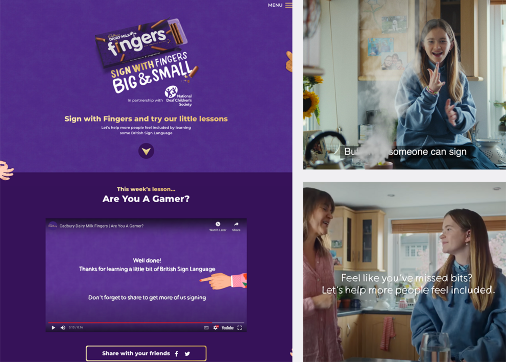 - Cadbury have partnered with the National Deaf Children’s Society, to build a website offering multiple lessons in British Sign Language, all accessible on the site and YouTube, for free.
