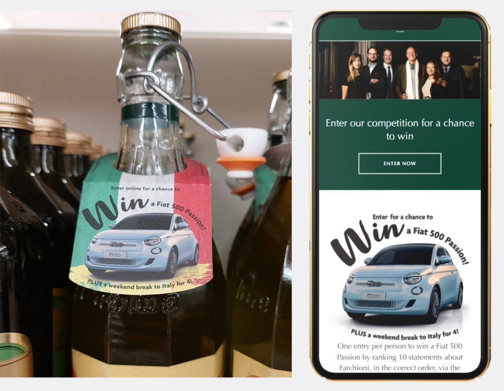 - Farchioni is offering consumers the chance to win 2 grand prizes; a Fiat 500C Electric Passion car and a trip to Italy for 4.